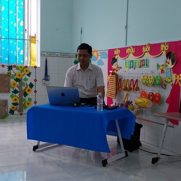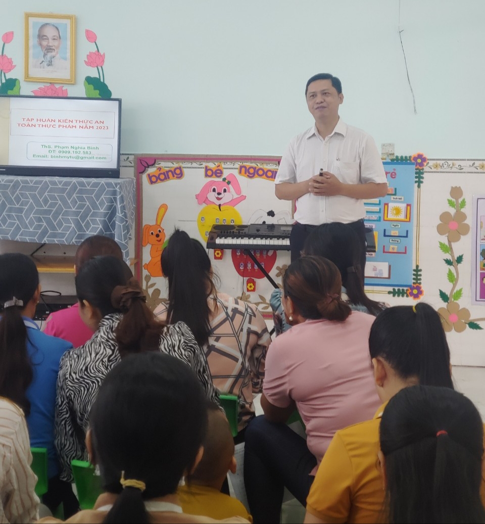 ThS. Phạm Nghĩa Bình trưởng khoa Y tế cộng đồng- dinh dưỡng- an toàn thực phẩm, trung tâm y tế huyện Mỹ Tú đến hỗ trợ cập nhật kiến thức an toàn vệ sinh thực phẩm cho Cán bộ, giáo viên, nhân viên trực tiếp chăm sóc-nuôi dưỡng trẻ tại trường Mầm non Phú Mỹ.