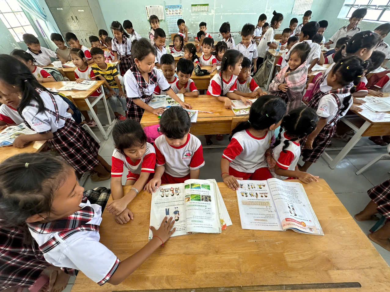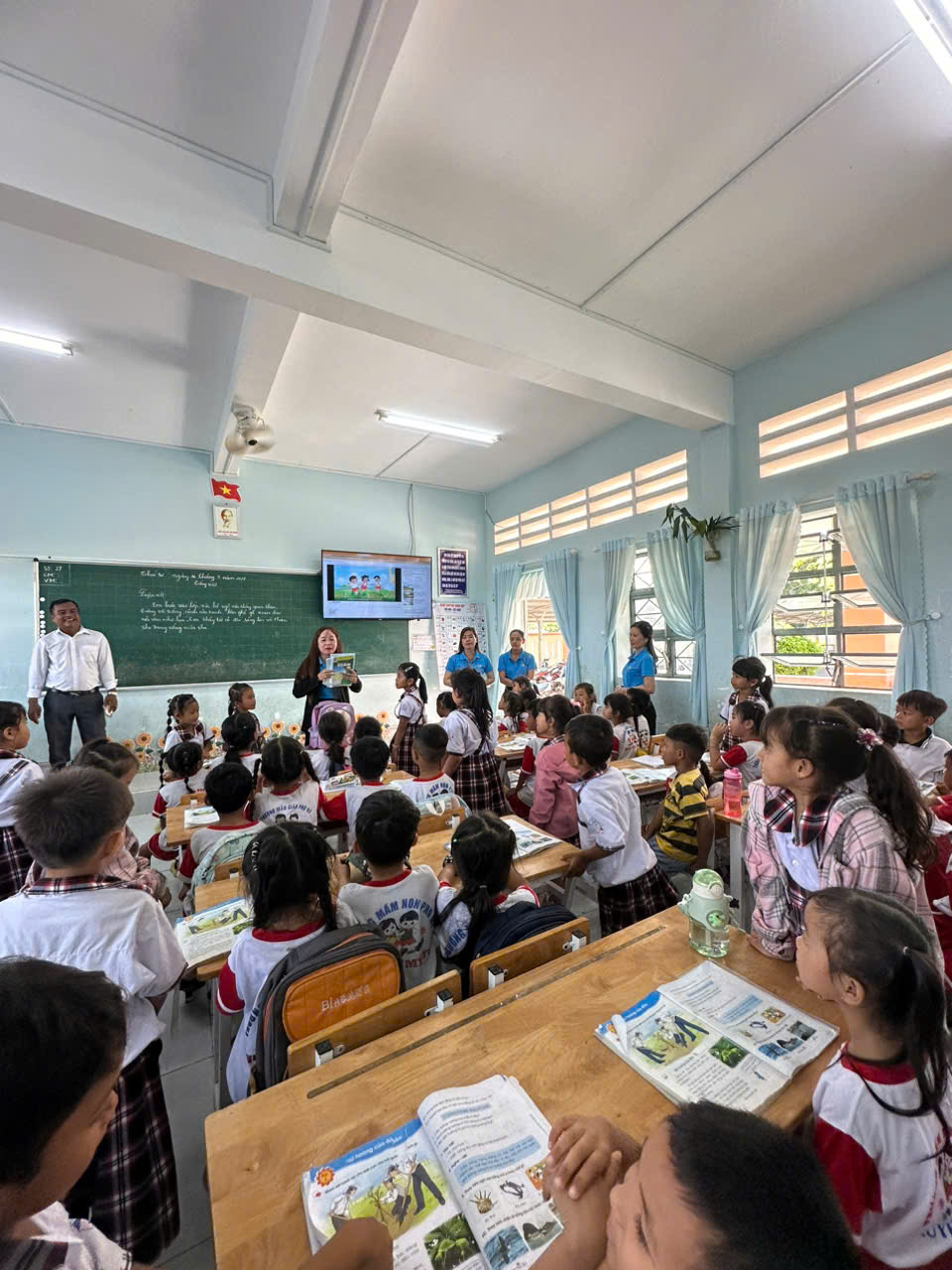 Trong chuyến tham quan, các bé được cô giáo hướng dẫn tham quan khuôn viên trường tiểu học: từ sân trường, thư viện, phòng học, đến khu vực vệ sinh – nơi các con sẽ sinh hoạt khi bước vào lớp Một. Đặc biệt, các con còn được trực tiếp ngồi vào ghế học sinh tiểu học, giao lưu cùng thầy cô giáo lớp Một và các anh chị học sinh đang học tại trường.