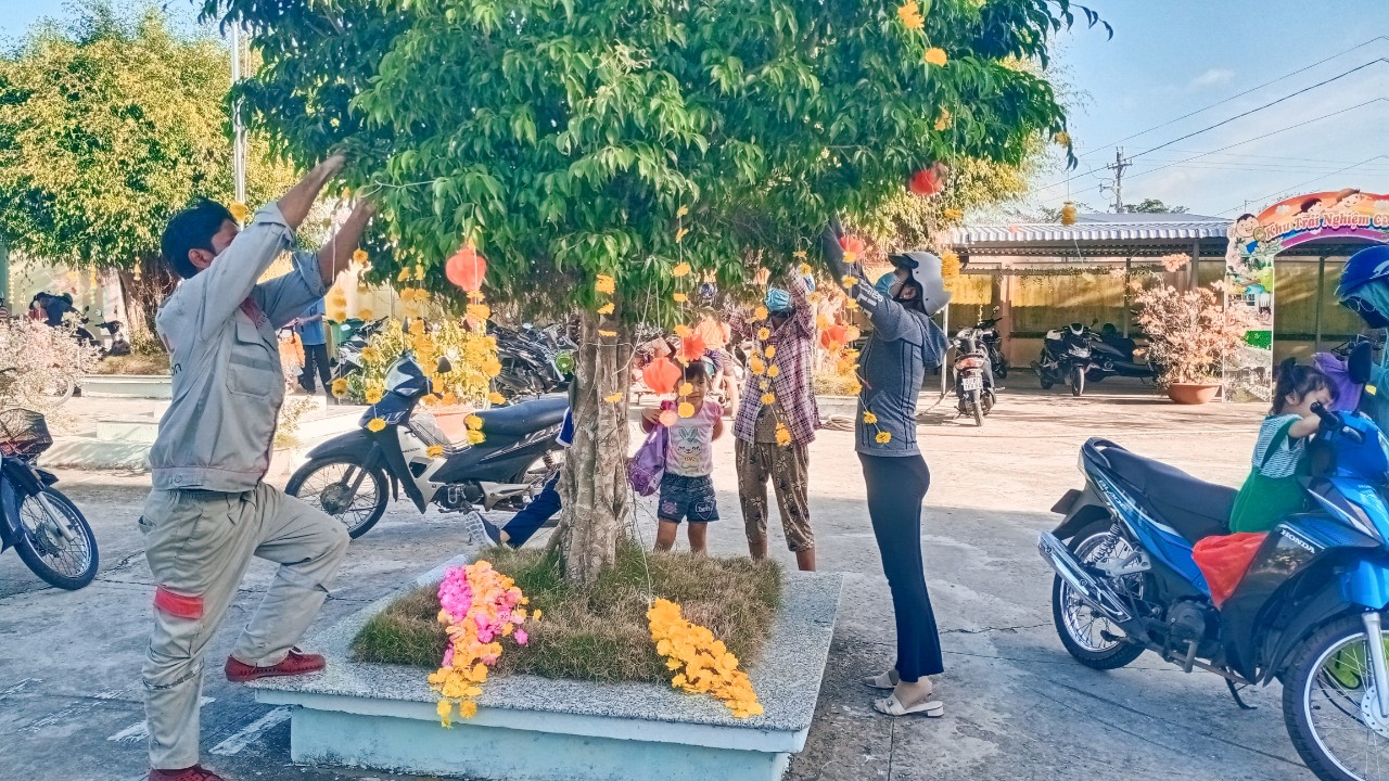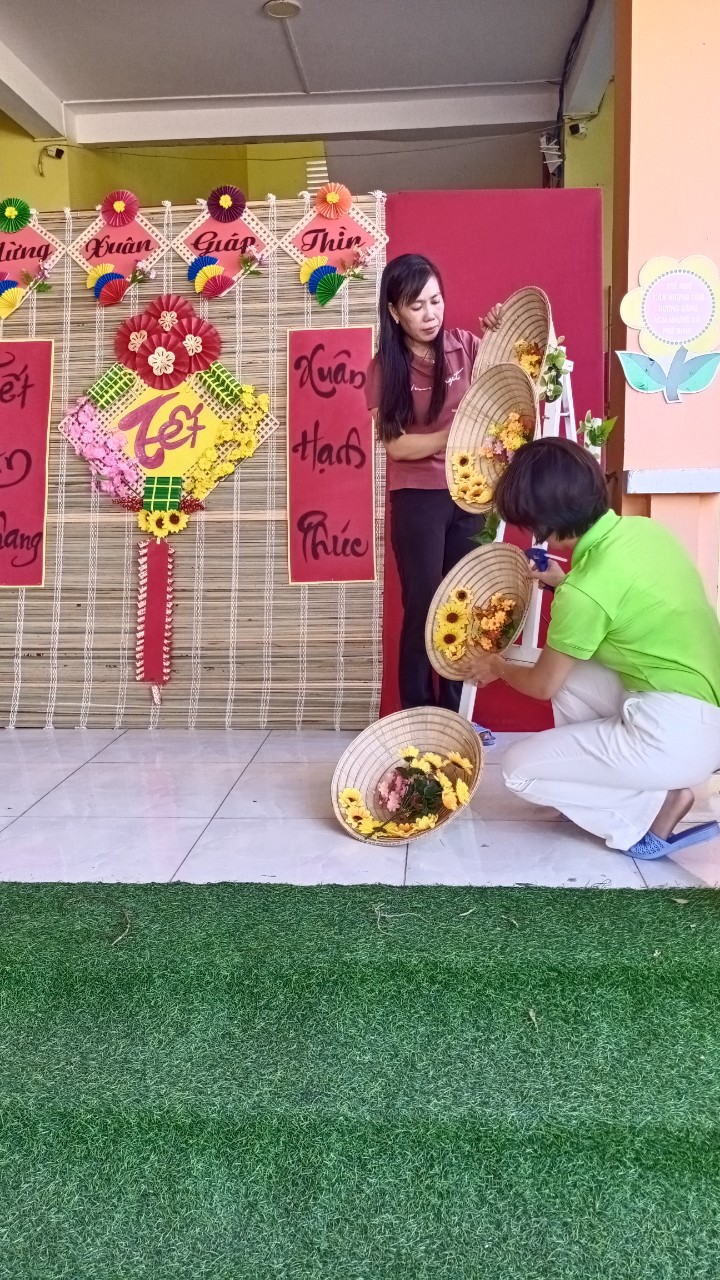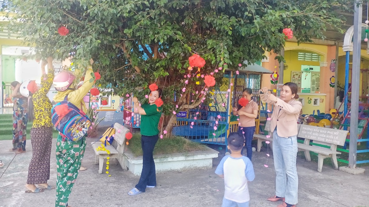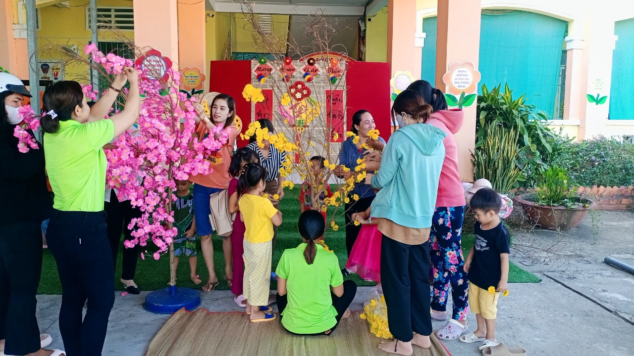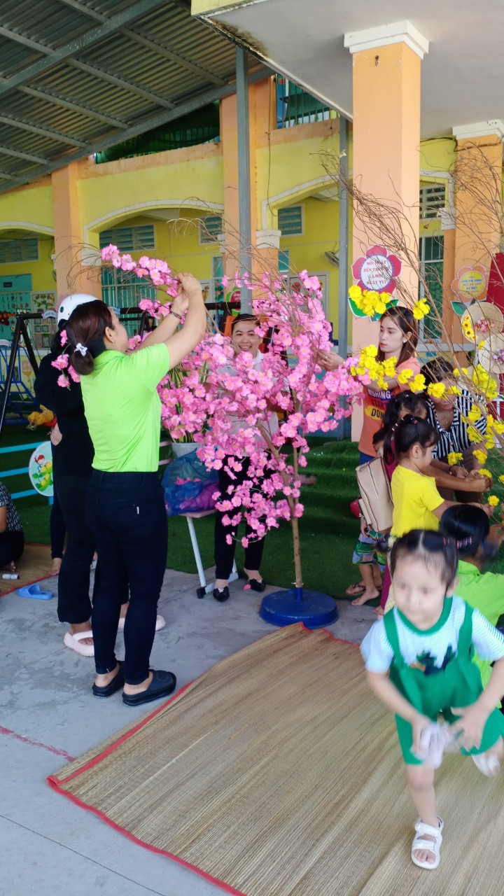 Hoạt động trang trí Tết ở trường vừa tạo không khí mùa xuân, hân hoan đón Tết vừa tạo không gian cho các con hào hứng khi Tết đã vào đến tận trường Mầm non của mình. Để tạo nên không khí ấm áp và đầy phấn khích cho các bé, các cô giáo đã kêu gọi cha mẹ trẻ cùng tham gia trang trí sân trường bằng những cành đào và cành mai đầy màu sắc, nhiều lồng đèn, dây hoa lung linh được treo dưới tán cây... Tất cả được thực hiện với hy vọng tạo ra một không gian Tết thật đẹp và đầy niềm vui cho các bé.