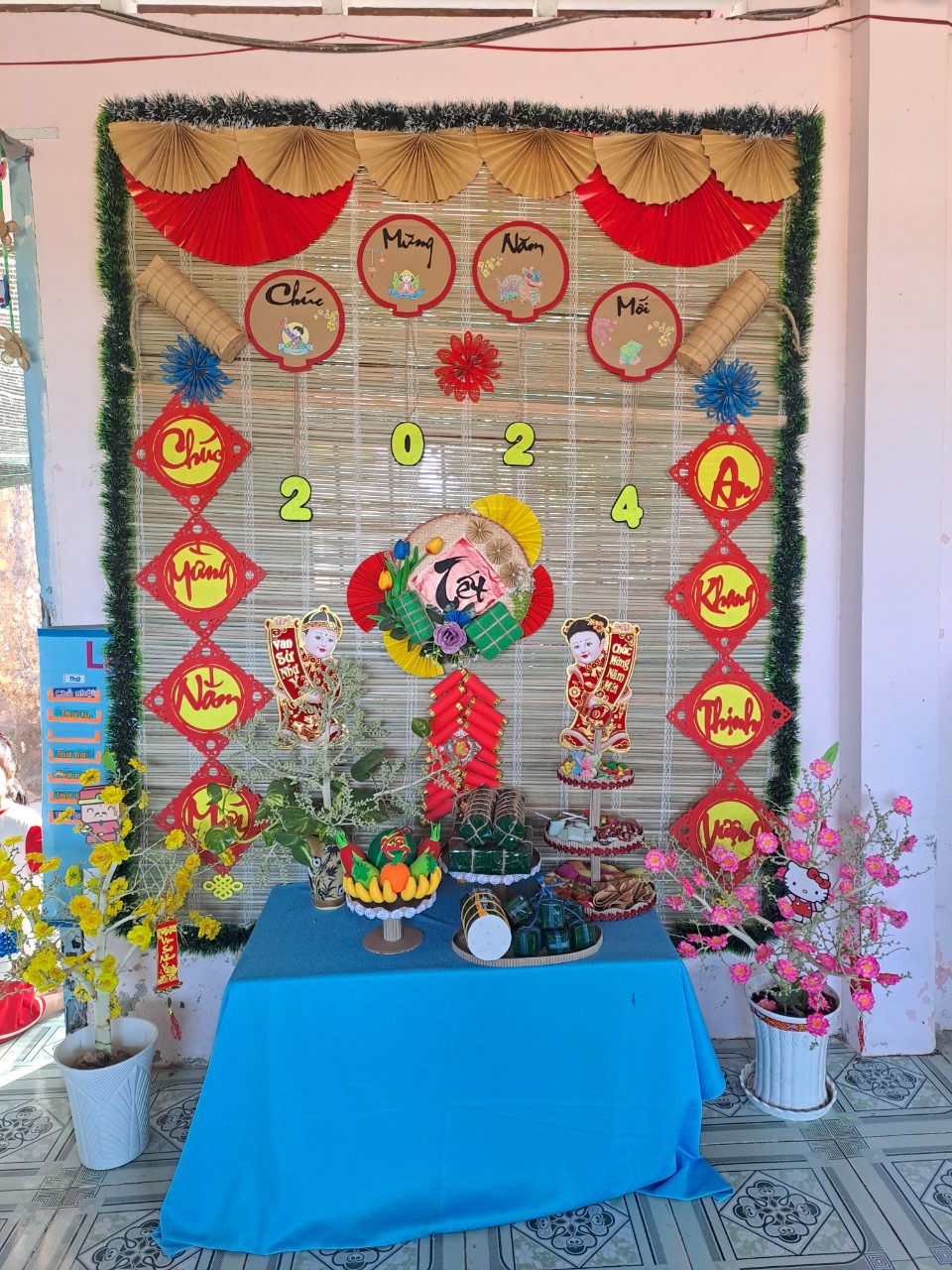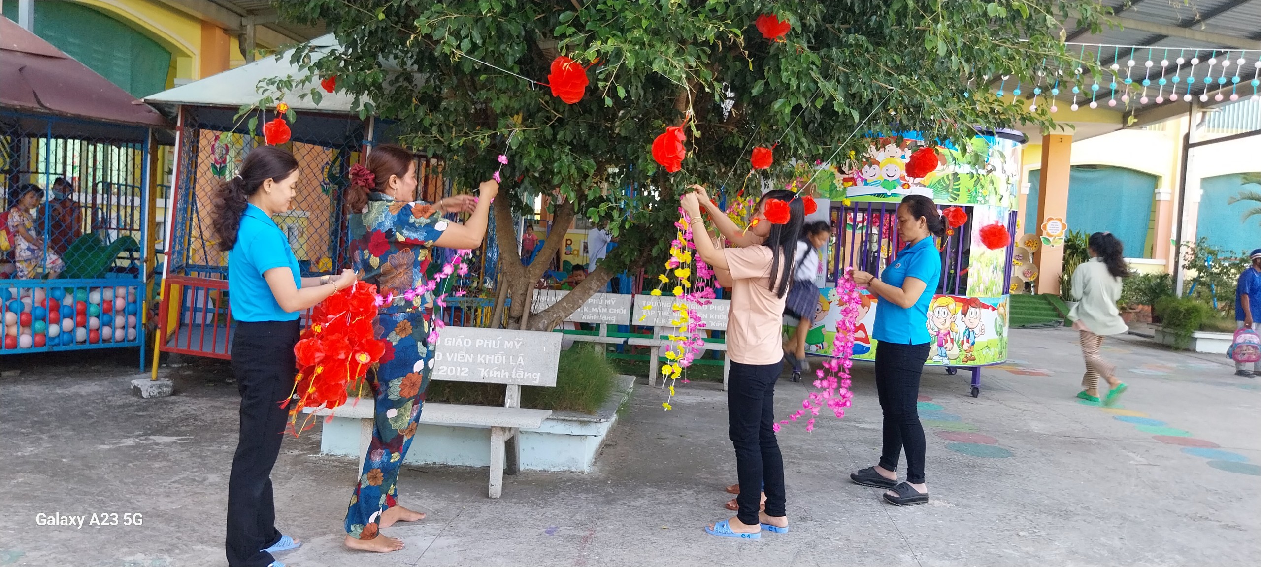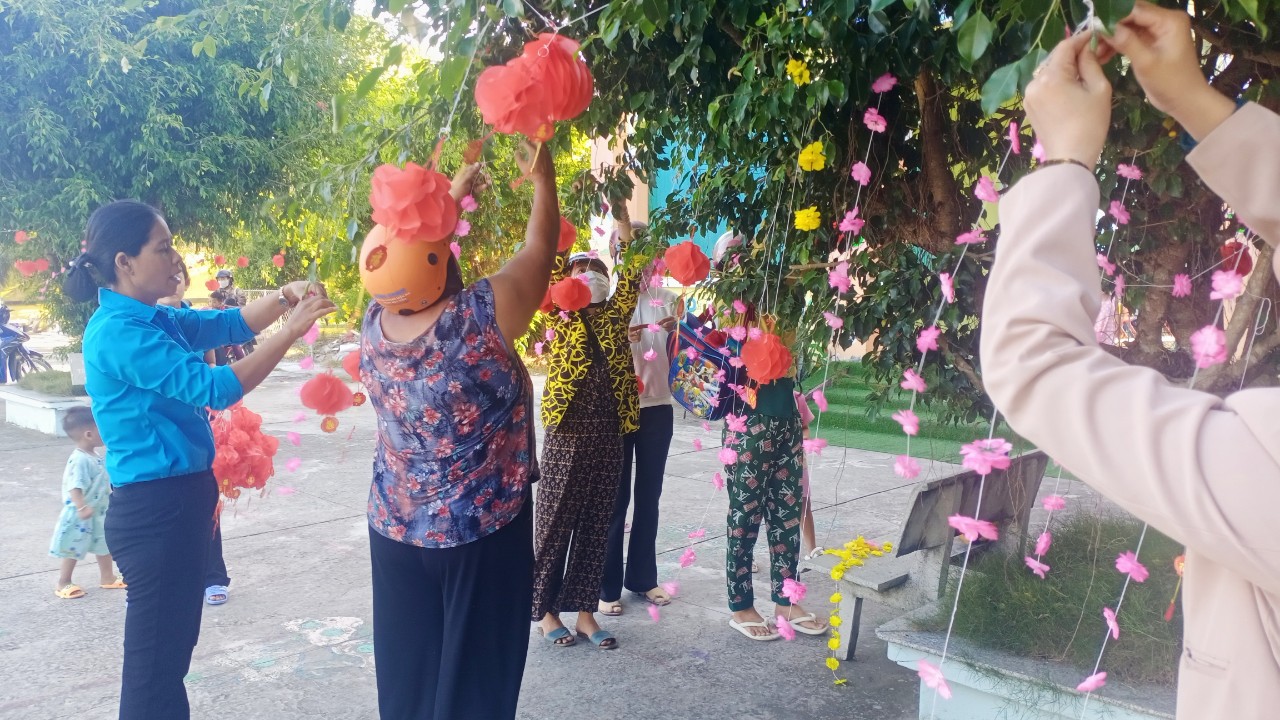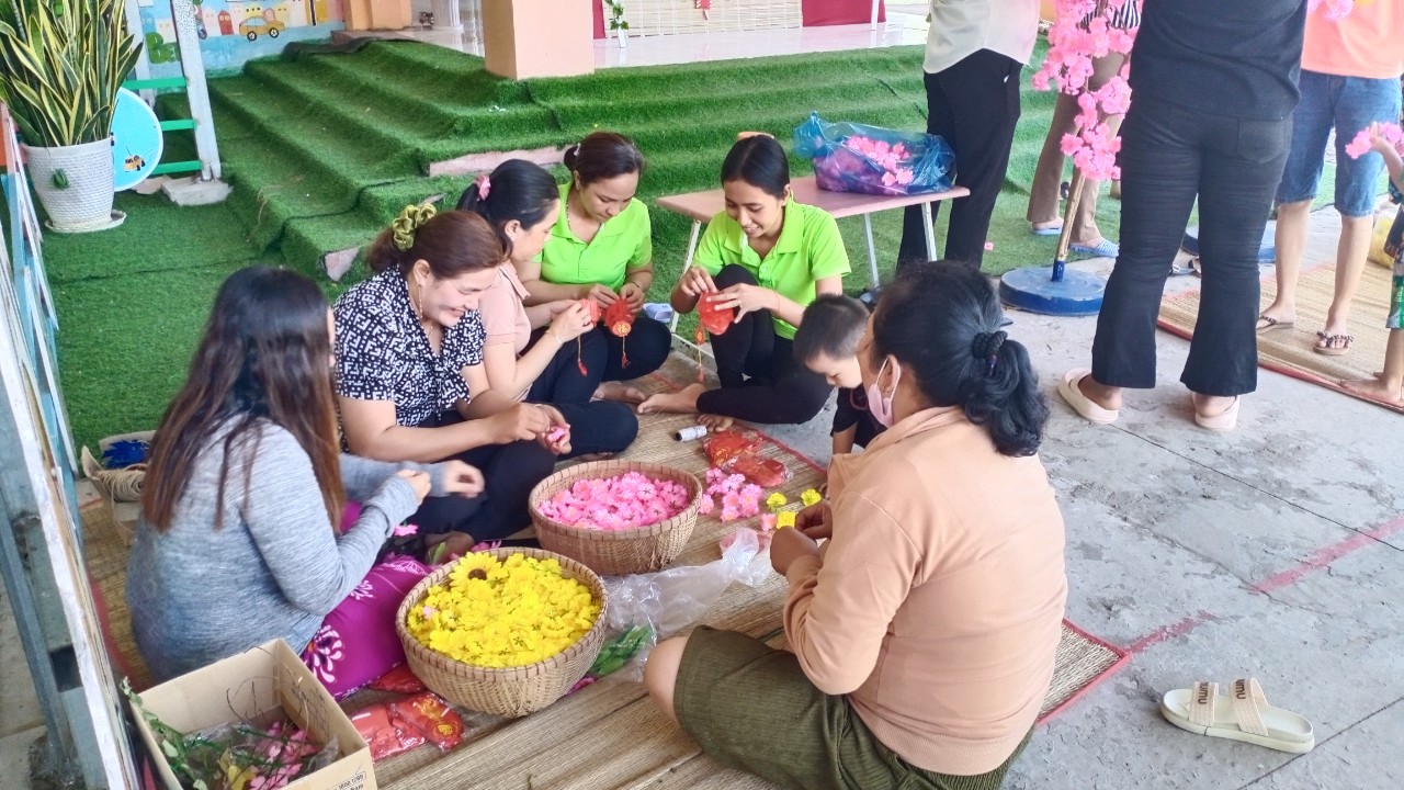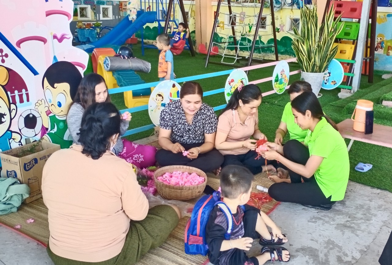 Hoạt động trang trí Tết ở trường vừa tạo không khí mùa xuân, hân hoan đón Tết vừa tạo không gian cho các con hào hứng khi Tết đã vào đến tận trường Mầm non của mình. Để tạo nên không khí ấm áp và đầy phấn khích cho các bé, các cô giáo đã kêu gọi cha mẹ trẻ cùng tham gia trang trí sân trường bằng những cành đào và cành mai đầy màu sắc, nhiều lồng đèn, dây hoa lung linh được treo dưới tán cây... Tất cả được thực hiện với hy vọng tạo ra một không gian Tết thật đẹp và đầy niềm vui cho các bé.
