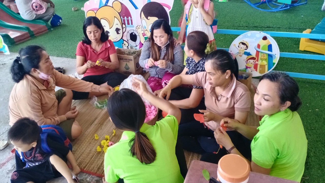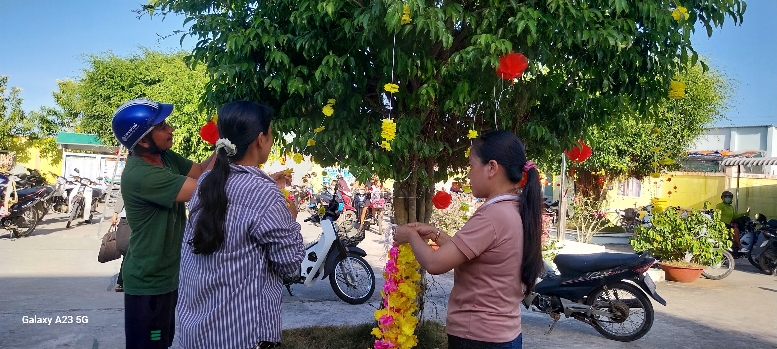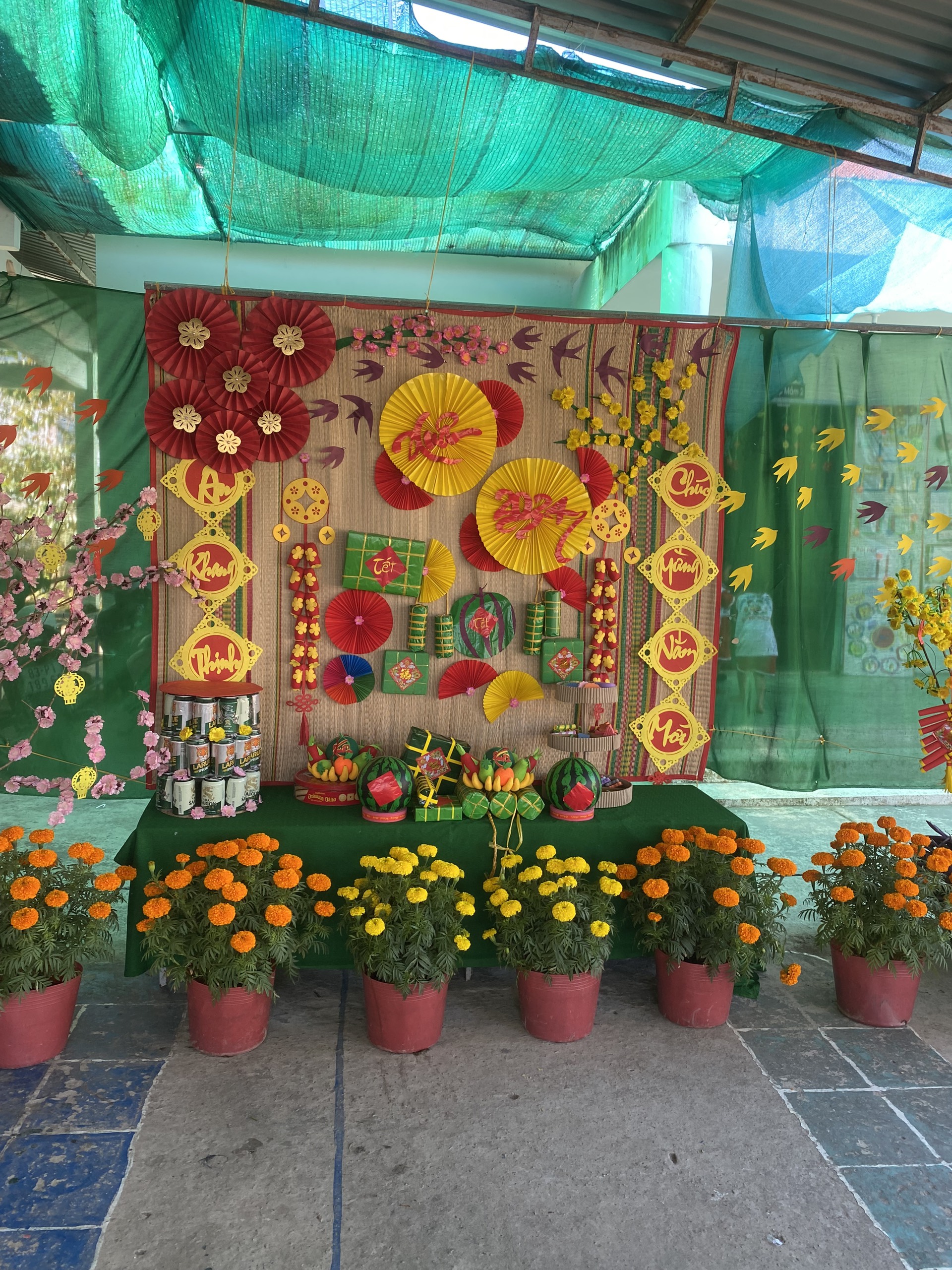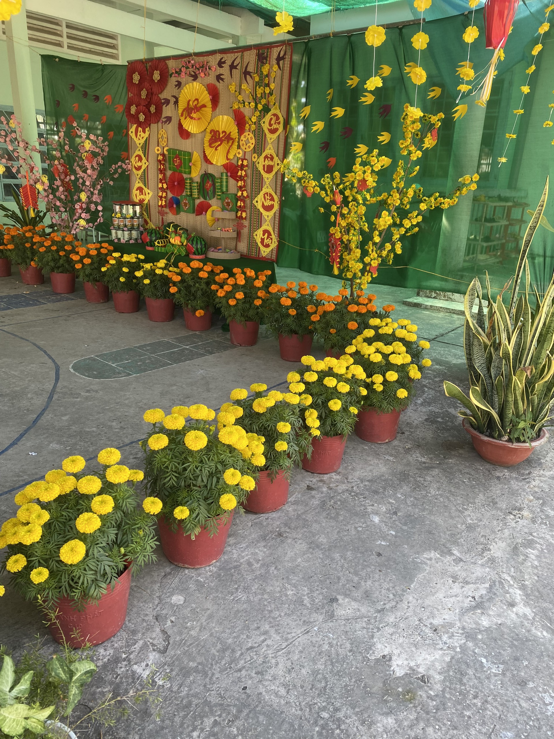 Hoạt động trang trí Tết ở trường vừa tạo không khí mùa xuân, hân hoan đón Tết vừa tạo không gian cho các con hào hứng khi Tết đã vào đến tận trường Mầm non của mình. Để tạo nên không khí ấm áp và đầy phấn khích cho các bé, các cô giáo đã kêu gọi cha mẹ trẻ cùng tham gia trang trí sân trường bằng những cành đào và cành mai đầy màu sắc, nhiều lồng đèn, dây hoa lung linh được treo dưới tán cây... Tất cả được thực hiện với hy vọng tạo ra một không gian Tết thật đẹp và đầy niềm vui cho các bé.