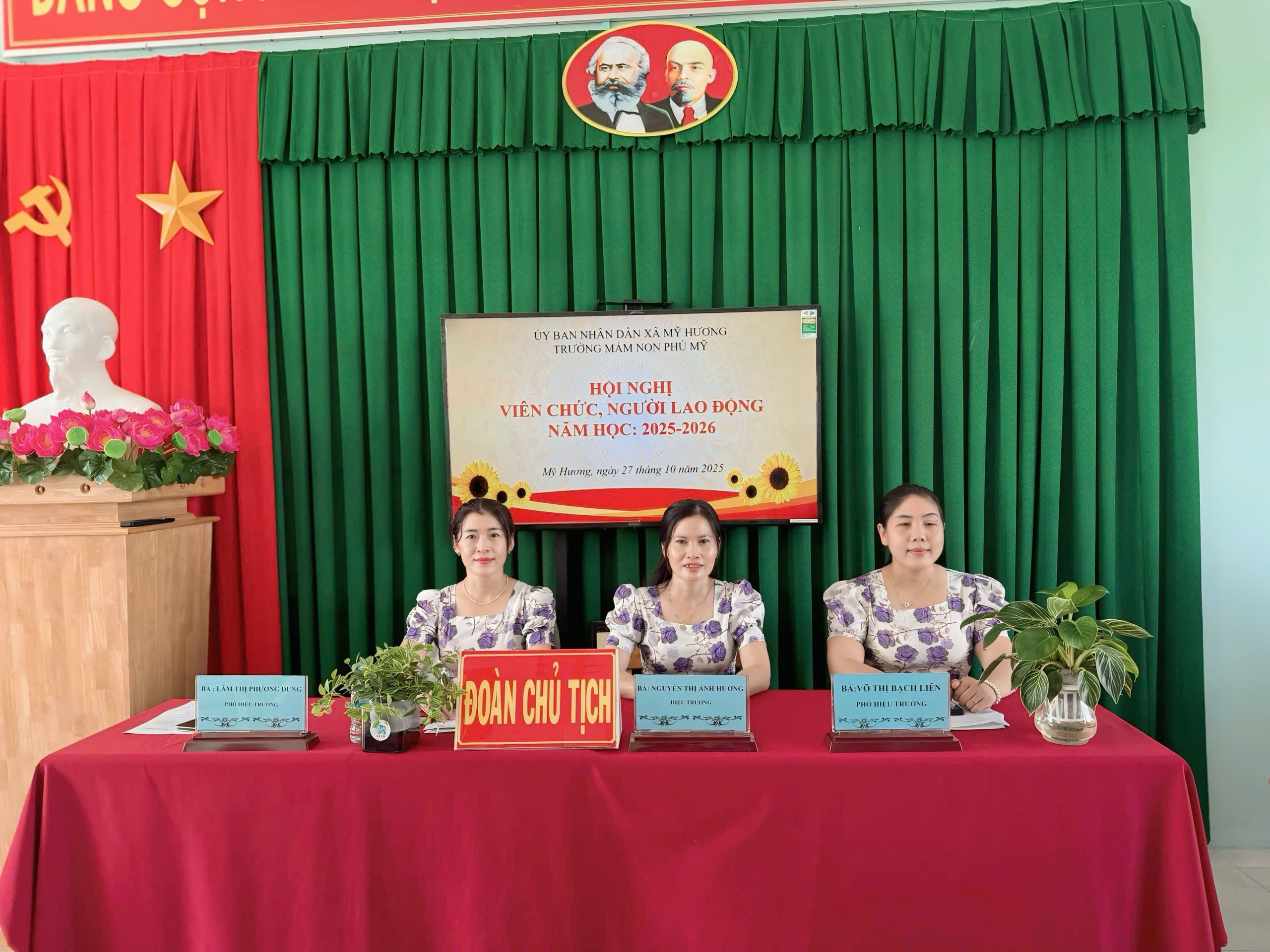 Để điều hành chương trình, Hội nghị đã bầu ra Đoàn chủ tịch gồm: Cô Nguyễn Thị Ánh Hường – Bí thư chi bộ, Hiệu trưởng nhà trường, Cô Võ Thị bạch Liên và Cô Lâm Thị Phương Dung - Phó Hiệu trưởng nhà trường; thư ký Hội nghị là Cô Sơn Thanh Mai.