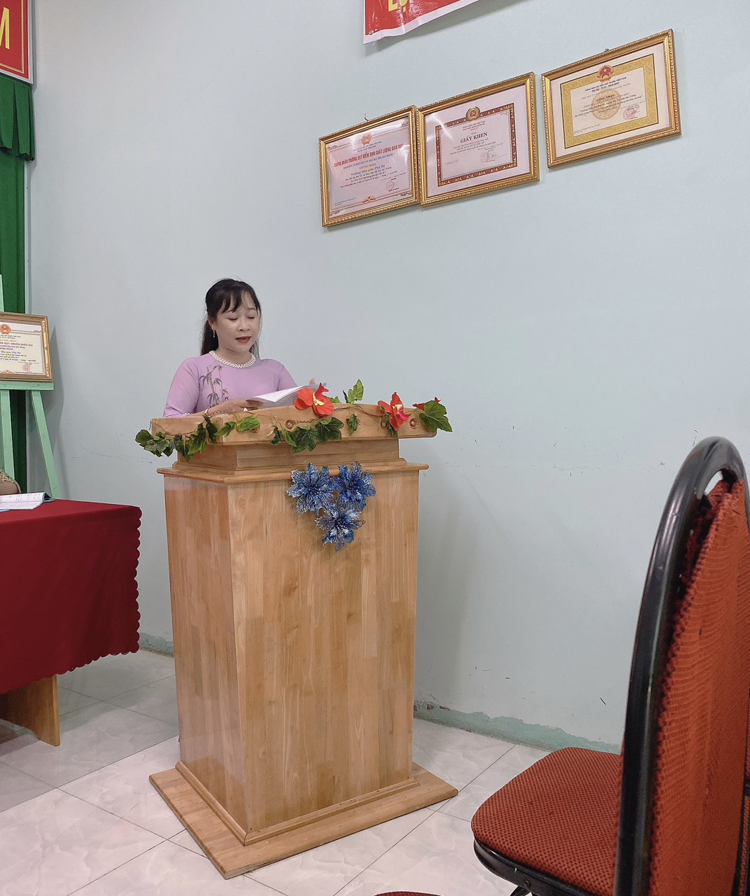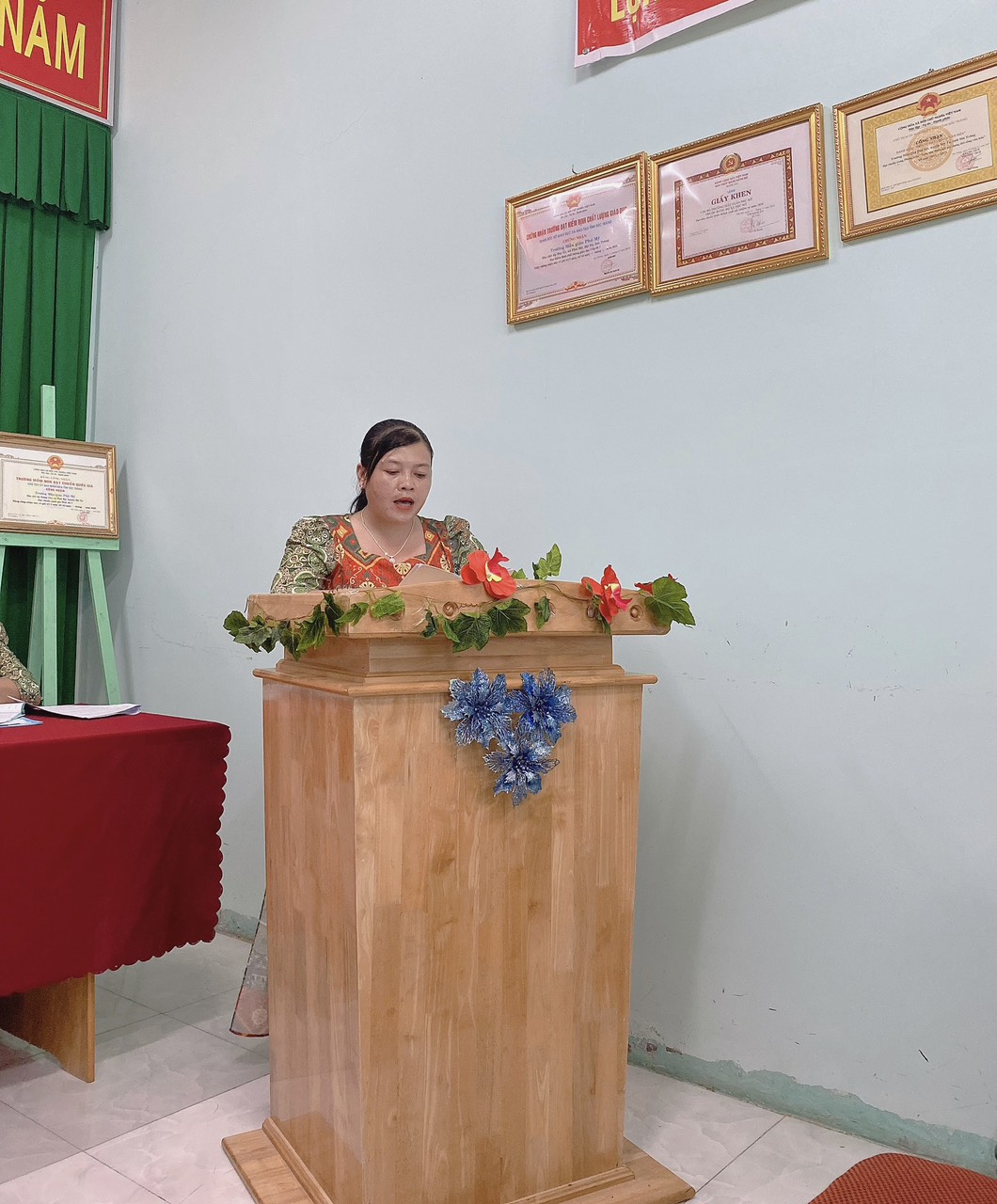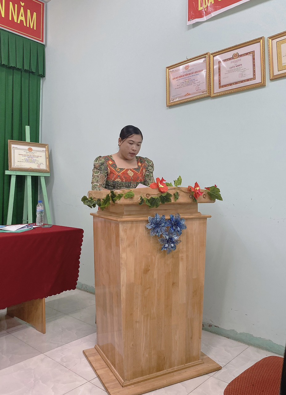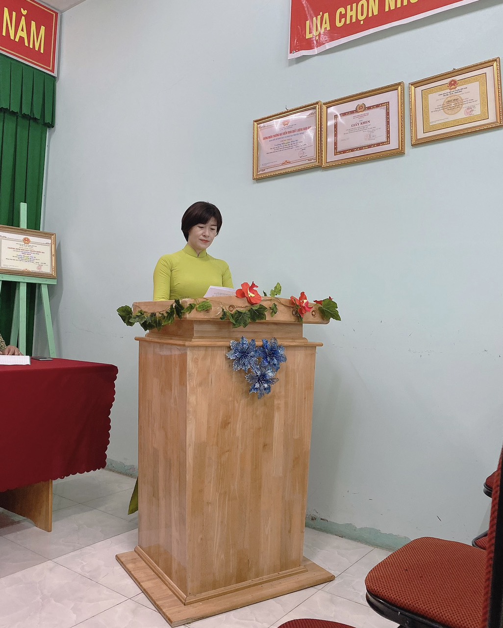 Cô: Sơn Thị Kiều Hương- Phó chủ tịch CĐCS lên báo cáo tổng kết hoạt động công đoàn năm học 2022-2023 và đề ra phương hướng thực hiện nhiệm vụ năm học 2023-2024: