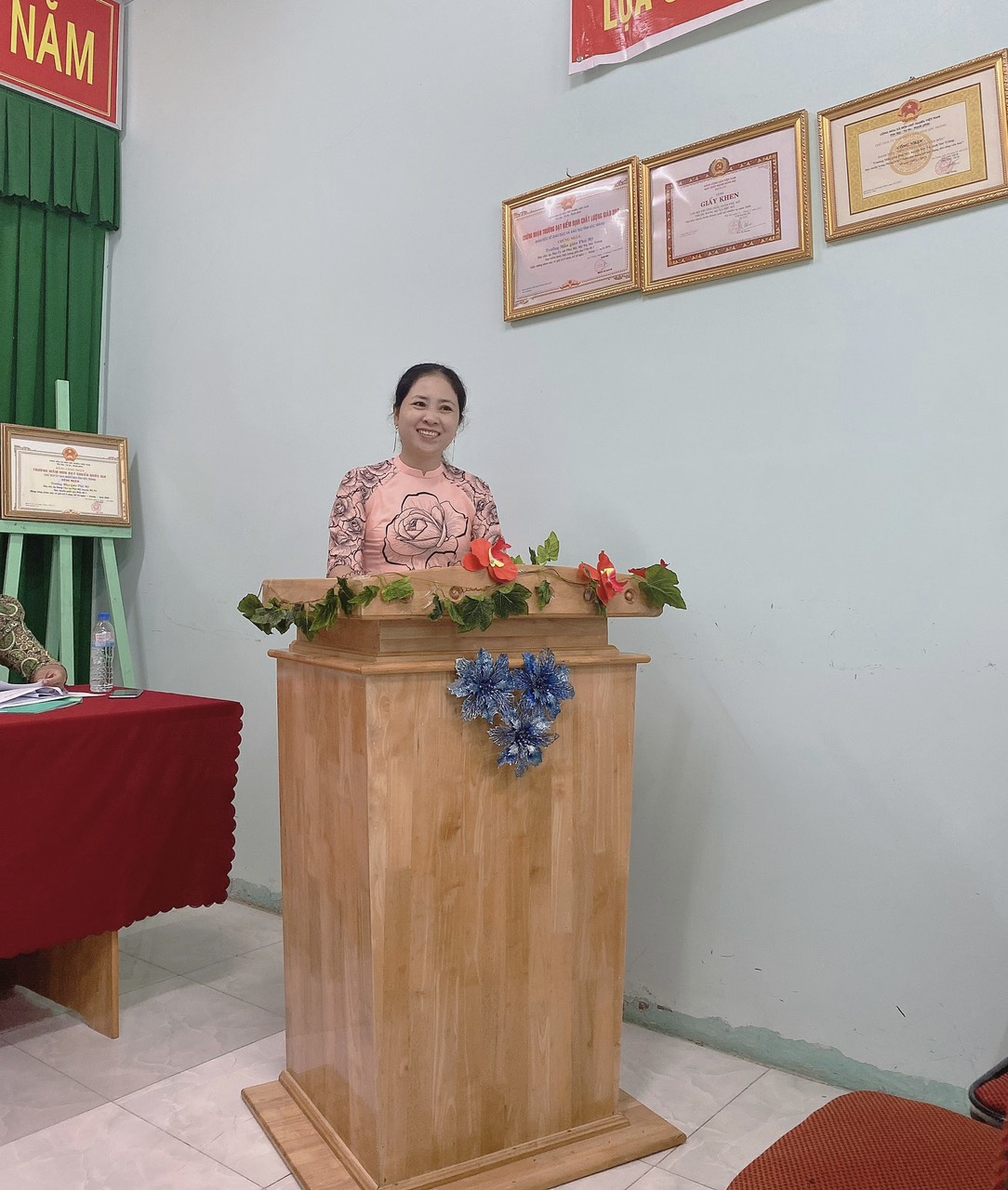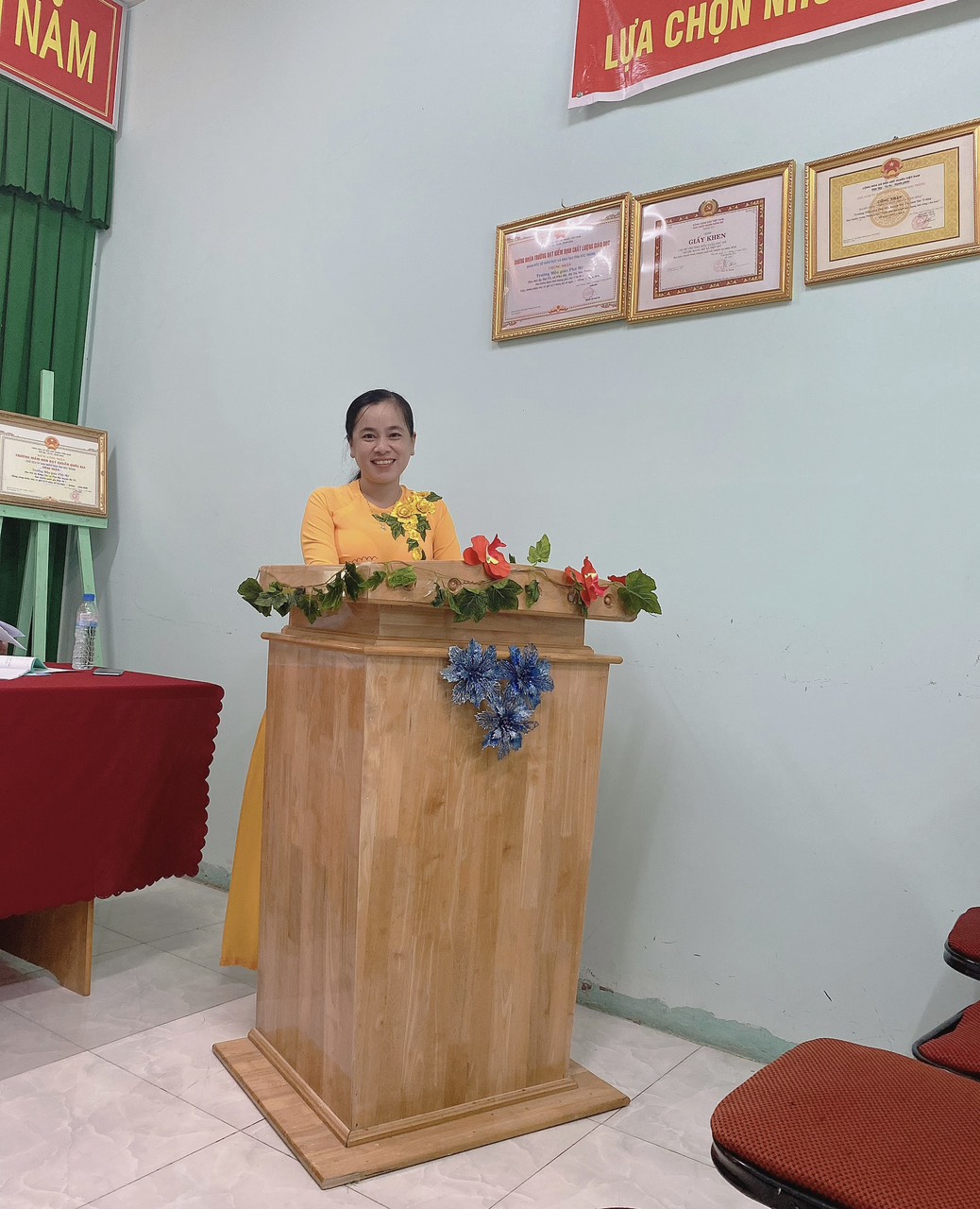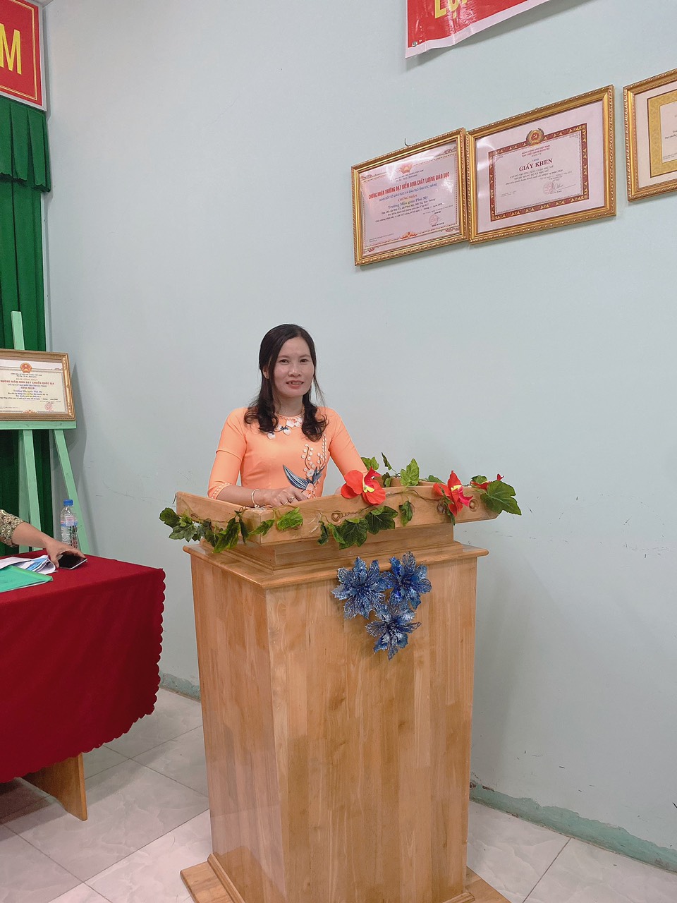 Cô: Sơn Thị Kiều Hương- Phó chủ tịch CĐCS lên báo cáo tổng kết hoạt động công đoàn năm học 2022-2023 và đề ra phương hướng thực hiện nhiệm vụ năm học 2023-2024: