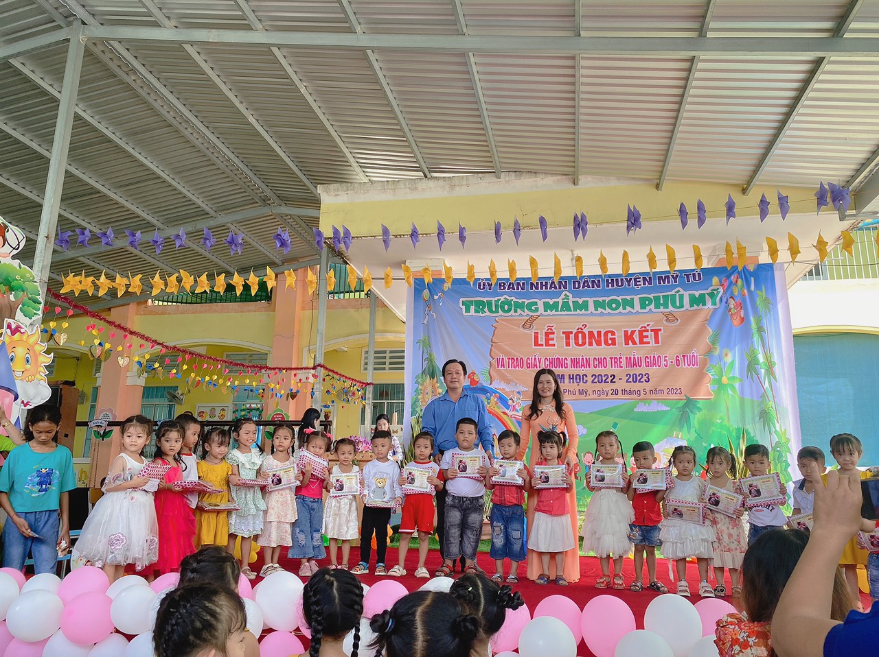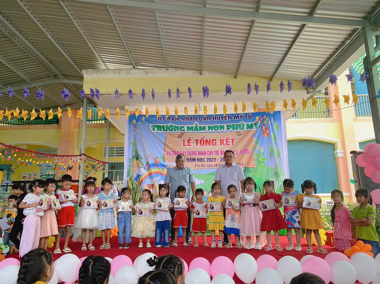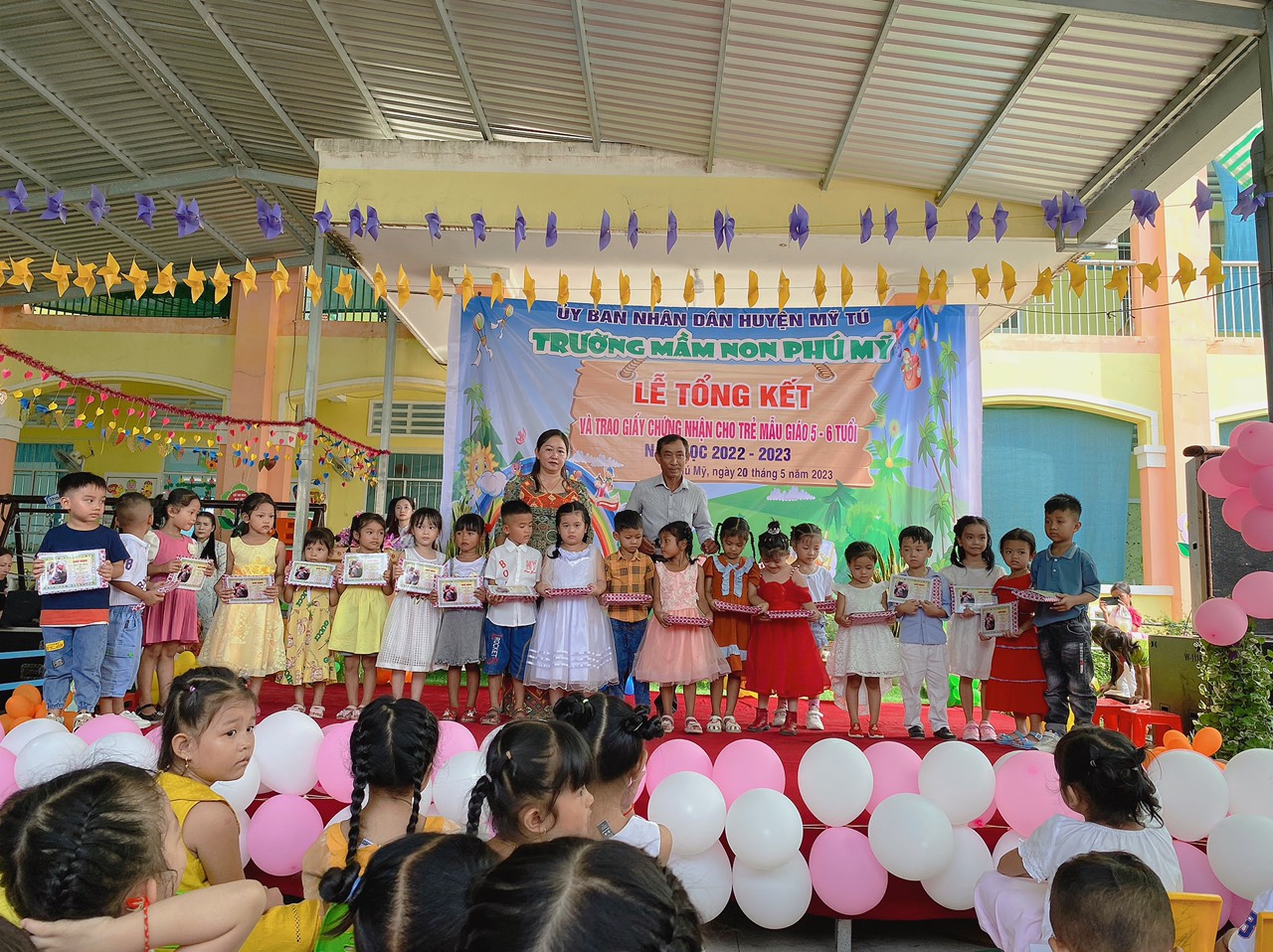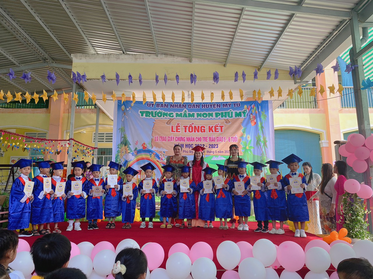 Năm học 2022 - 2023, một năm học cùng với sự nỗ lực và phấn đấu của tập thể sư phạm trường mầm non Phú Mỹ. Đây cũng là lúc cô và trò trường mầm non Phú Mỹ điểm lại những nỗ lực phấn đấu và kết quả đạt được của nhà trường trong năm học vừa qua. Thực hiện kế hoạch số: 49/KH-MNPM ngày 08/5/2023 của Trường Mầm non Phú Mỹ tổ chức “Lễ tổng kết và trao giấy chứng nhận hoàn thành chương trình GDMN cho trẻ Mẫu giáo 5, 6 tuổi”. Vào ngày 20/5/2023, Trường Mầm non Phú Mỹ long trọng tổ chức “Lễ tổng kết và trao giấy chứng nhận hoàn thành chương trình GDMN cho trẻ Mẫu giáo 5, 6 tuổi”.