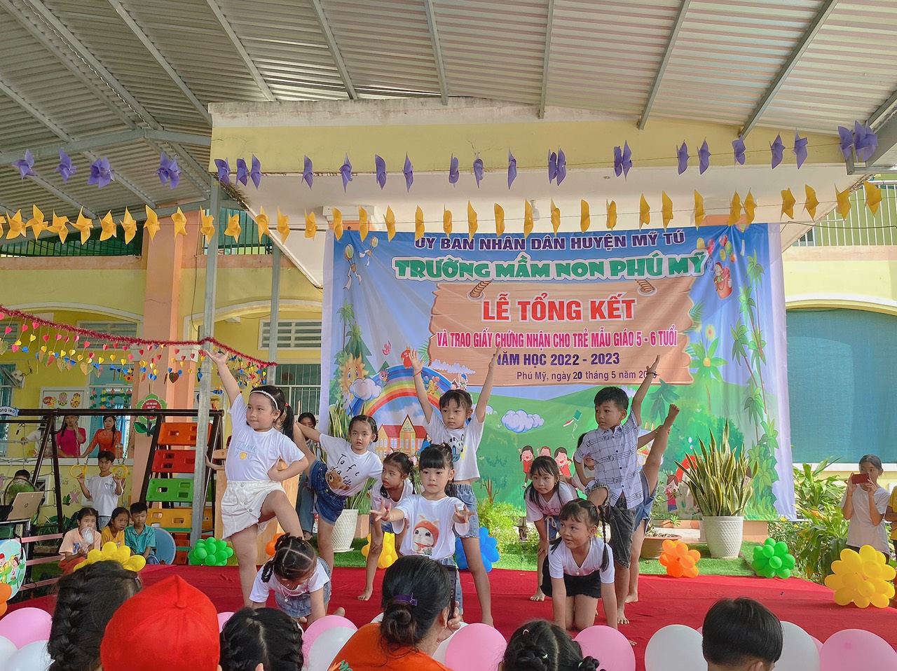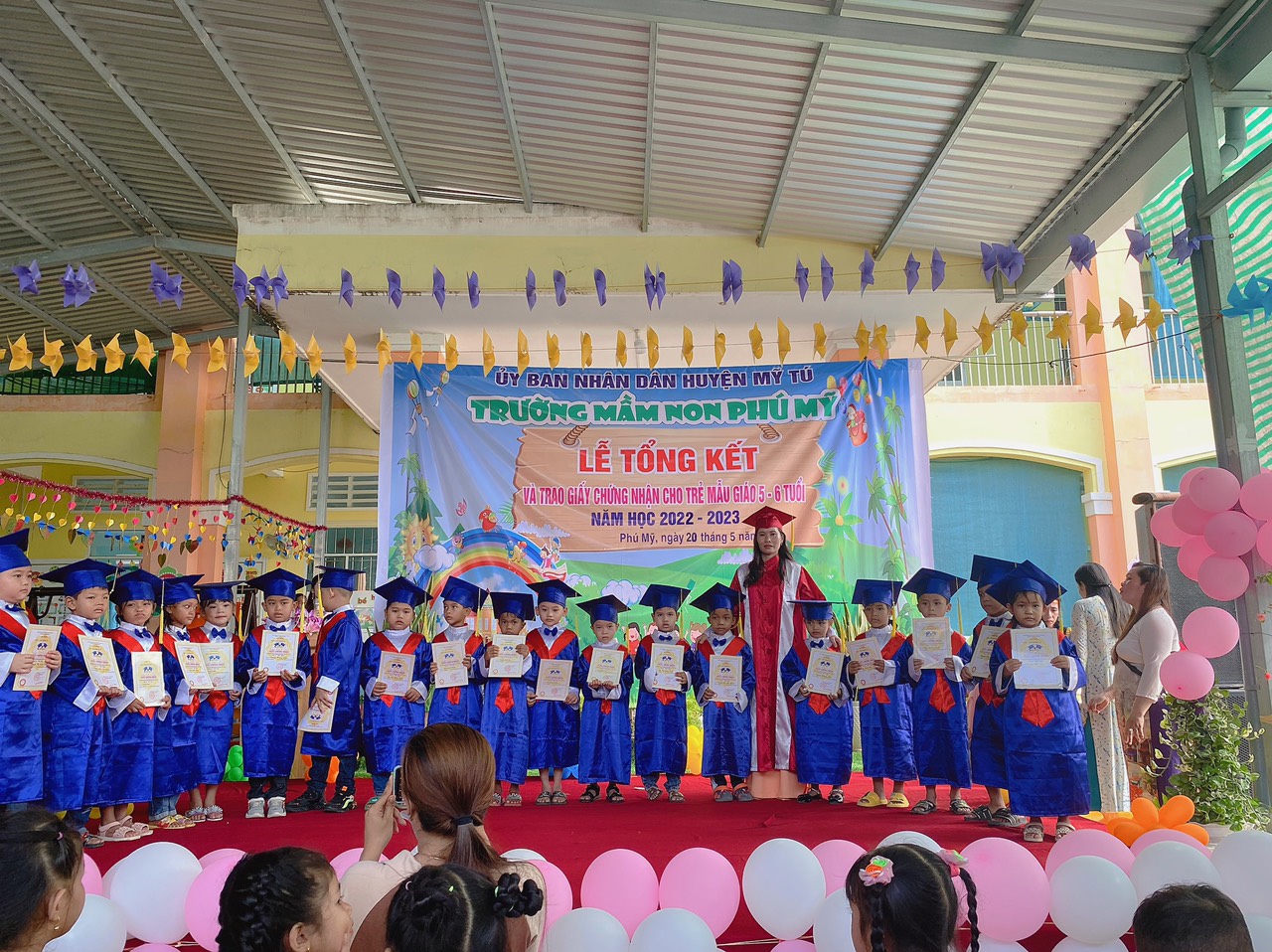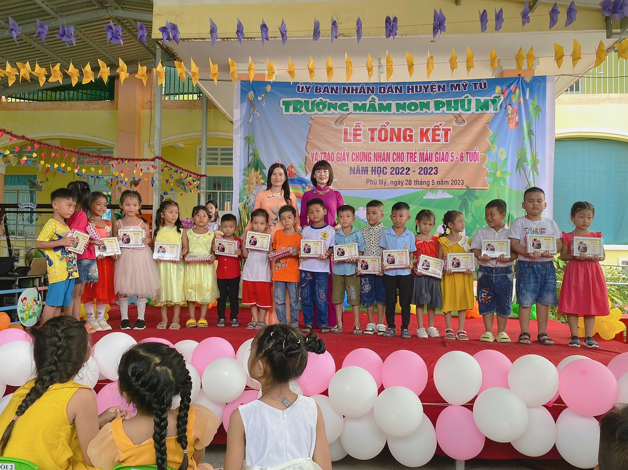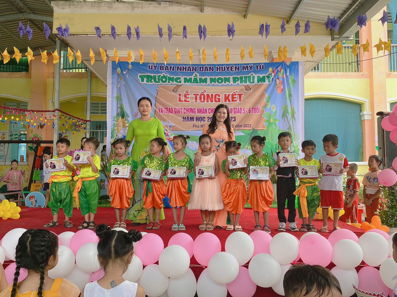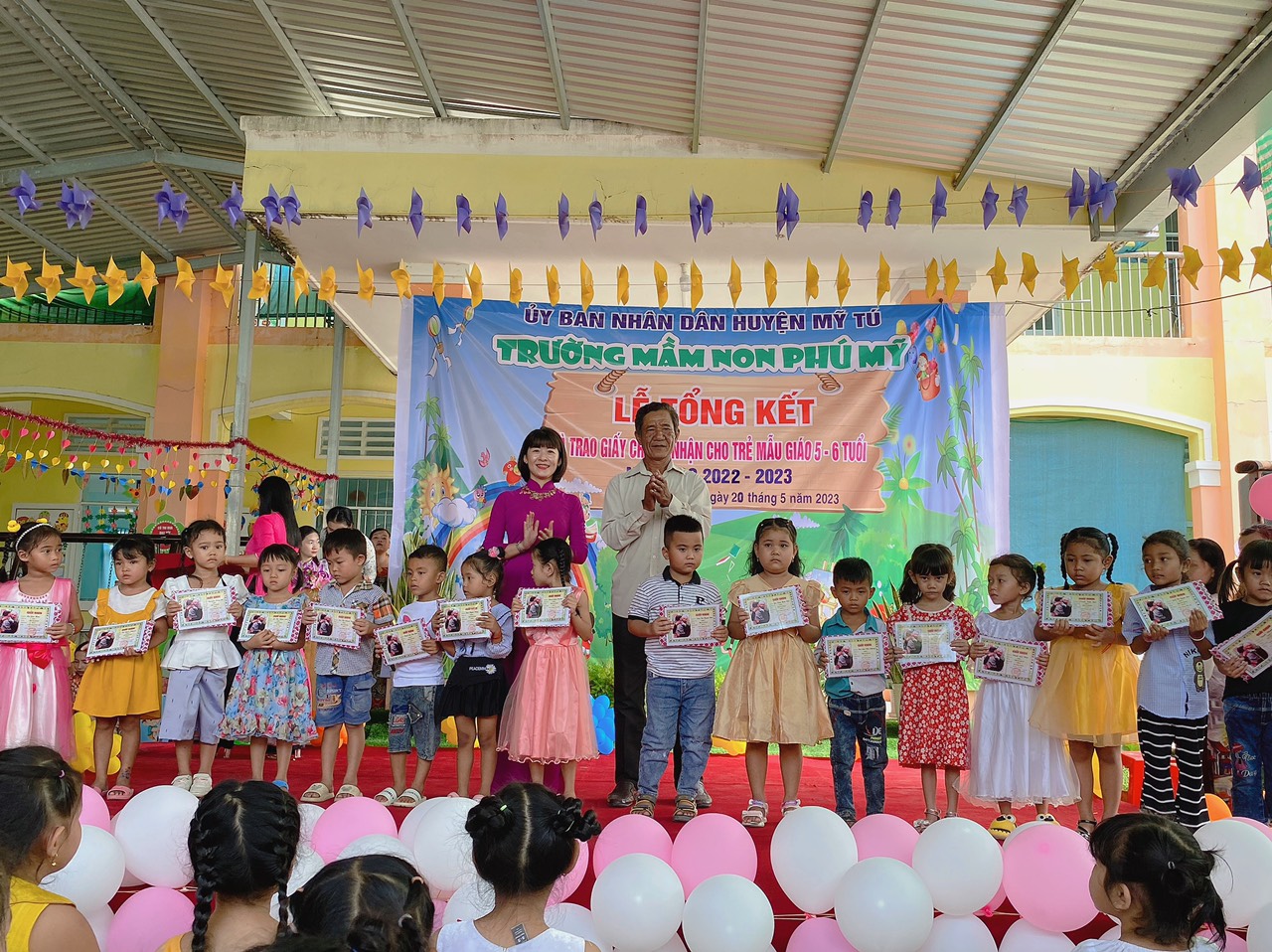 Năm học 2022 - 2023, một năm học cùng với sự nỗ lực và phấn đấu của tập thể sư phạm trường mầm non Phú Mỹ. Đây cũng là lúc cô và trò trường mầm non Phú Mỹ điểm lại những nỗ lực phấn đấu và kết quả đạt được của nhà trường trong năm học vừa qua. Thực hiện kế hoạch số: 49/KH-MNPM ngày 08/5/2023 của Trường Mầm non Phú Mỹ tổ chức “Lễ tổng kết và trao giấy chứng nhận hoàn thành chương trình GDMN cho trẻ Mẫu giáo 5, 6 tuổi”. Vào ngày 20/5/2023, Trường Mầm non Phú Mỹ long trọng tổ chức “Lễ tổng kết và trao giấy chứng nhận hoàn thành chương trình GDMN cho trẻ Mẫu giáo 5, 6 tuổi”.
