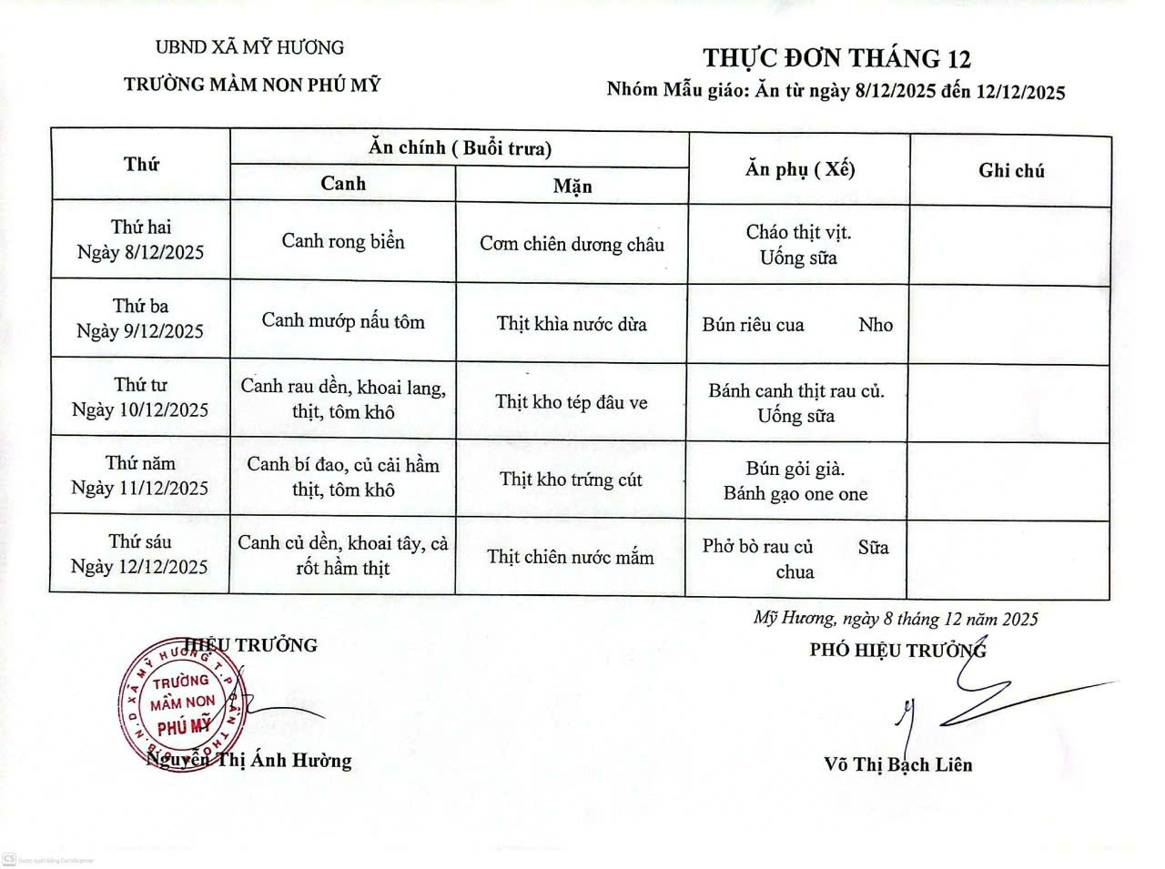 THỰC ĐƠN TUẦN 2 THÁNG 12