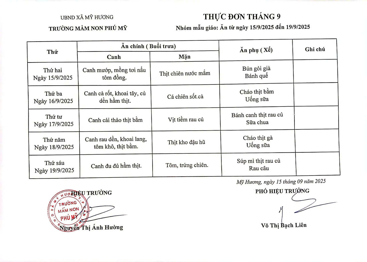 THỰC ĐƠN TUẦN 2 THÁNG 9 NHÓM MẪU GIÁO