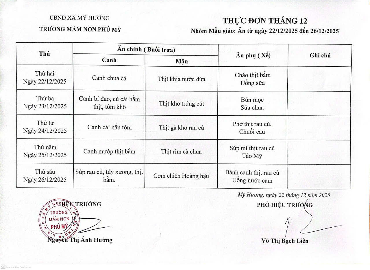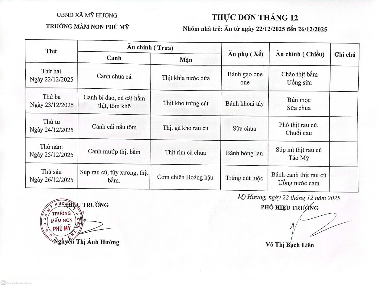 THỰC ĐƠN TUẦN 4 THÁNG 12